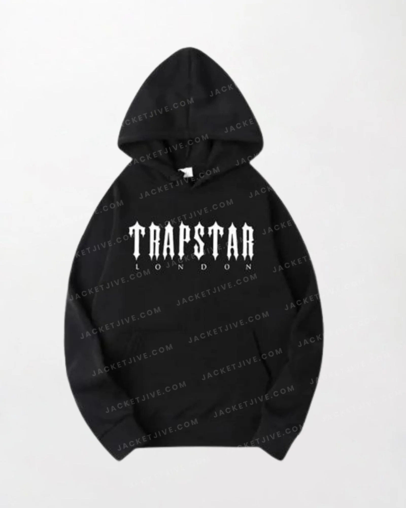 Black Trapstar Hoodie - Traps Text in White, Drawstring Hood, Kangaroo Pocket, Ribbed Cuff and Hem