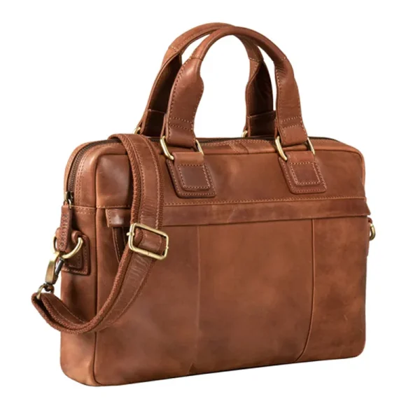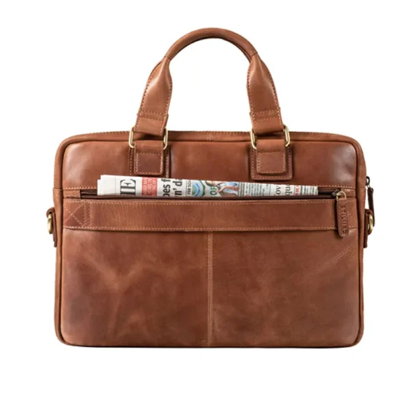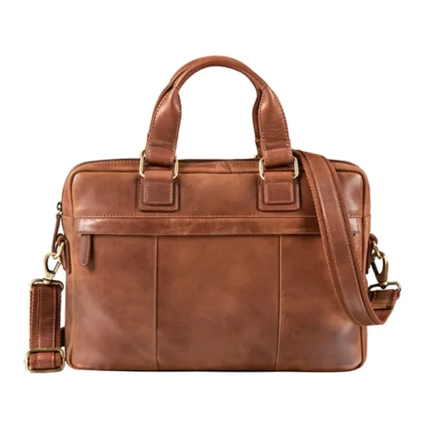 Business Casual Brown Leather Briefcase with multiple compartments and sleek design.