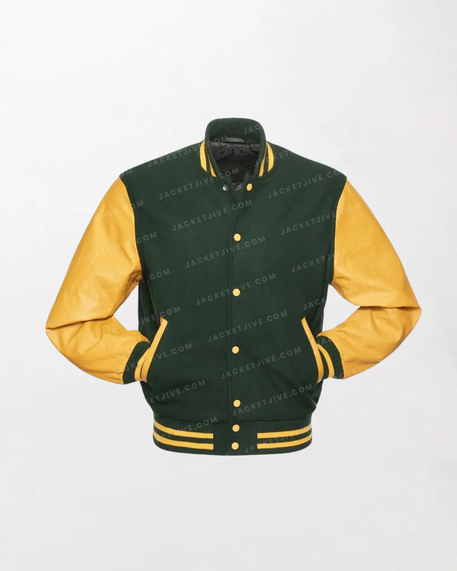 Forest Wool/Gold Leather Varsity Jacket - Green/Yellow, Zipper Front, Button Closure