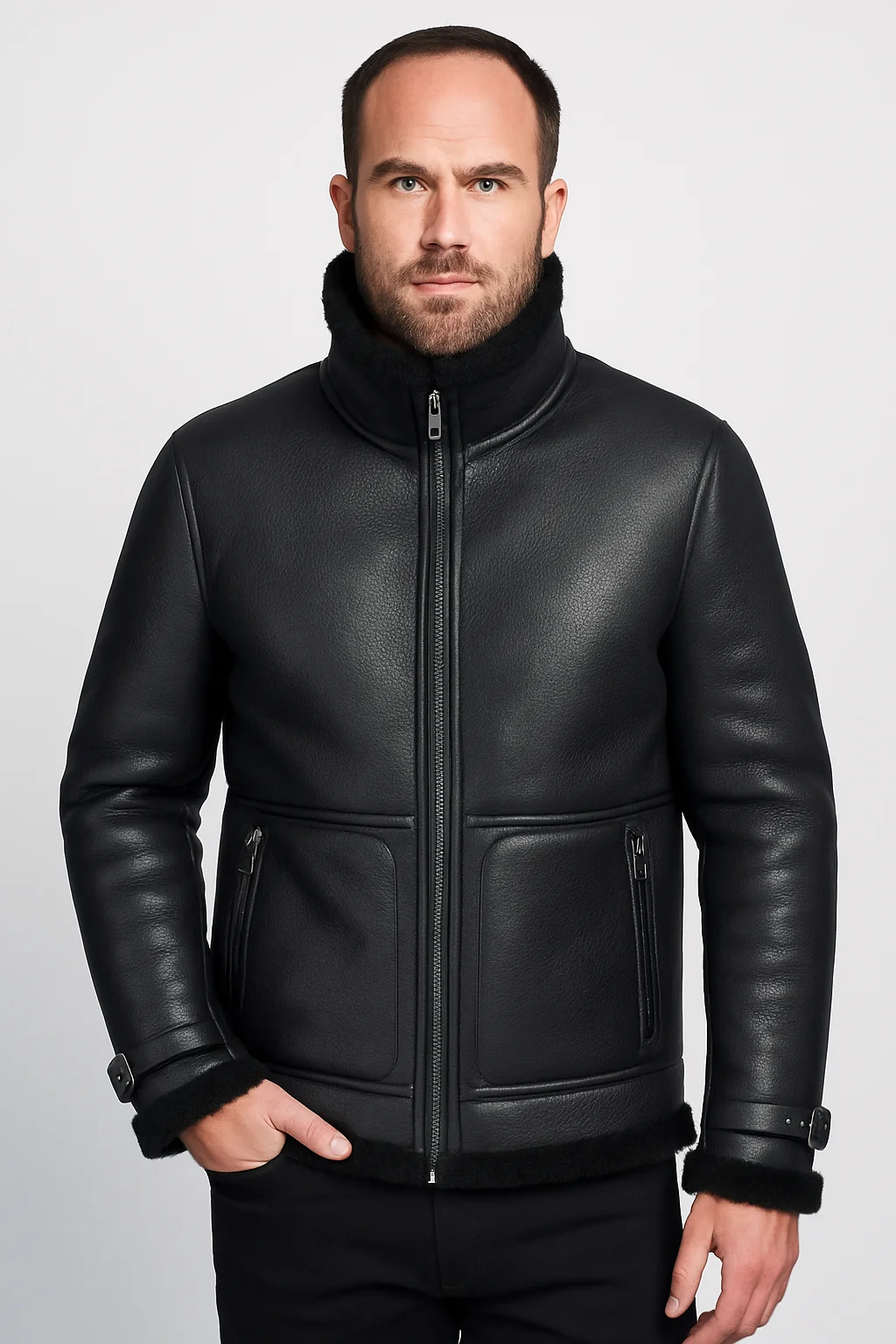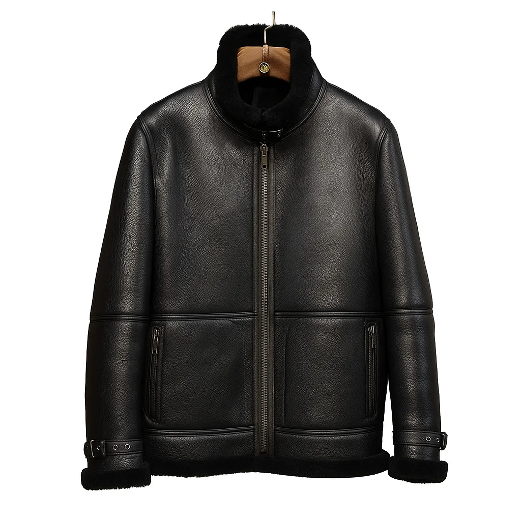 Men’s Black Shearling Leather Jacket – Winter Aviator Style