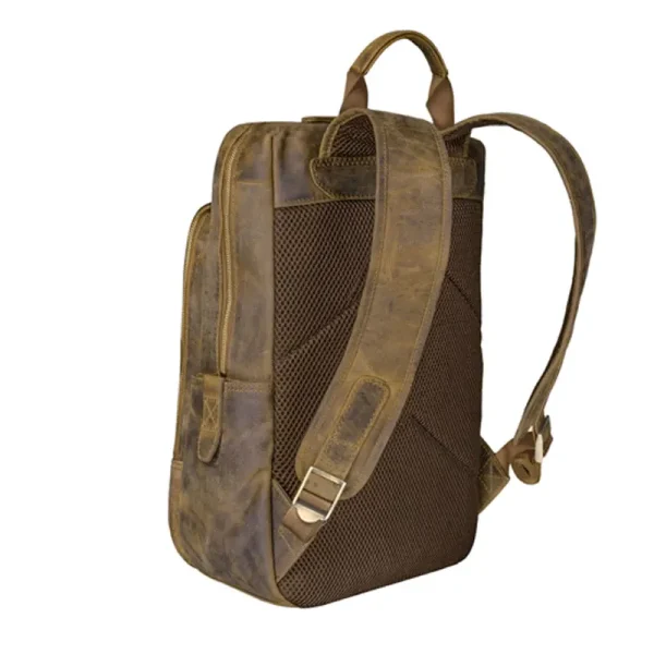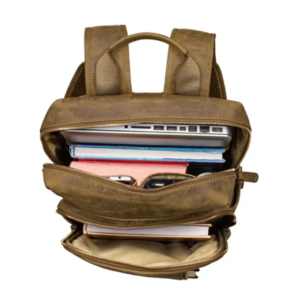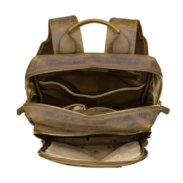 Professional Vintage Brown Leather Backpack with multiple compartments and adjustable straps.